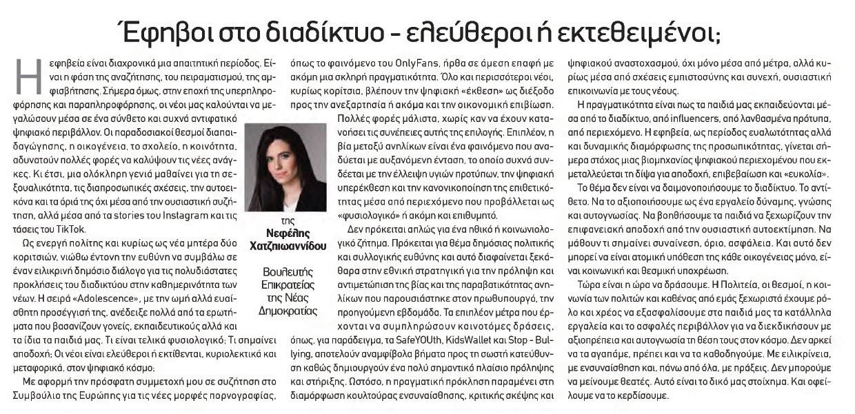 Με αφορμή την πρόσφατη συμμετοχή μου σε συζήτηση στο Συμβούλιο της Ευρώπης για τις νέες μορφές πορνογραφίας, όπως το φαινόμενο του OnlyFans, ήρθα σε άμεση επαφή με ακόμη μία σκληρή πραγματικότητα. Όλο και περισσότεροι νέοι, κυρίως κορίτσια, βλέπουν την ψηφιακή «έκθεση» ως διέξοδο προς την ανεξαρτησία ή ακόμα και την οικονομική επιβίωση. Πολλές φορές μάλιστα, χωρίς καν να έχουν κατανοήσει τις συνέπειες αυτής της επιλογής. Επιπλέον, η βία μεταξύ ανηλίκων, είναι ένα φαινόμενο που αναδύεται με αυξανόμενη ένταση, το οποίο συχνά συνδέεται με την έλλειψη υγιών προτύπων, την ψηφιακή υπερέκθεση και την κανονικοποίηση της επιθετικότητας μέσα από περιεχόμενο που προβάλλεται ως «φυσιολογικό» ή ακόμη και επιθυμητό.