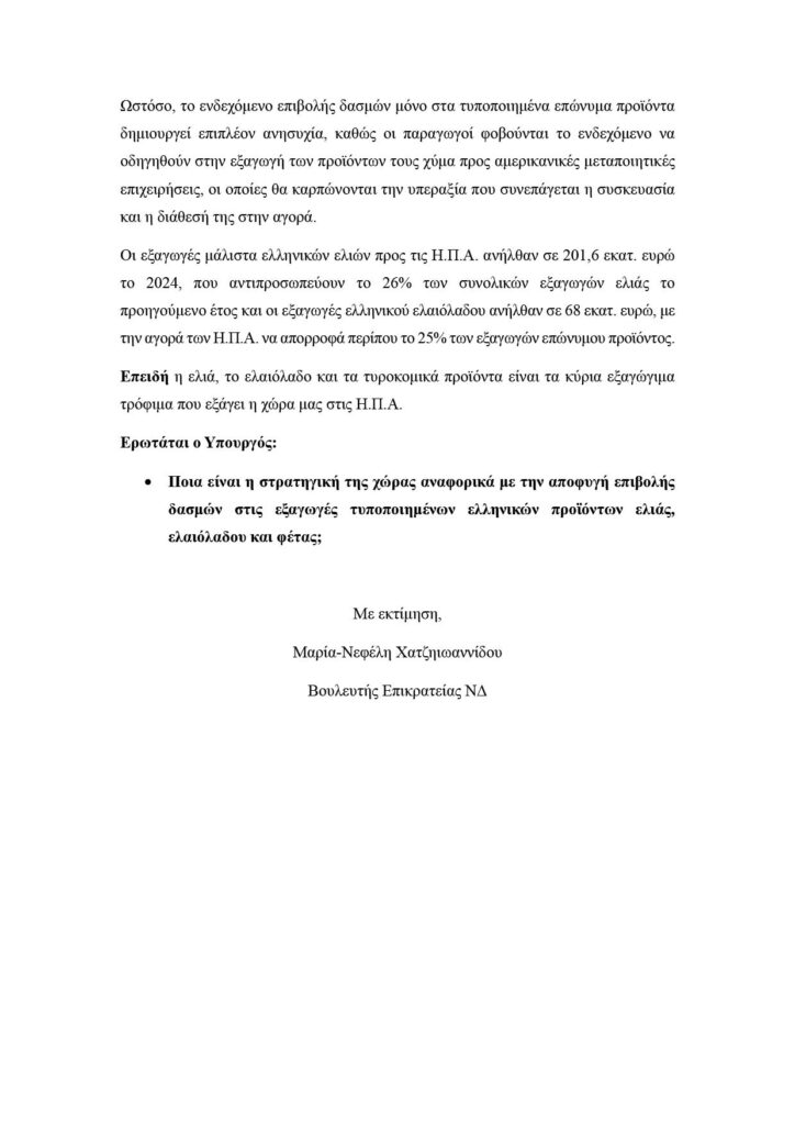 Έντονη ανησυχία των κλάδων των αγροτών, της μεταποίησης και των εξαγωγέων για το ενδεχόμενο επιβολής δασμών στις τυποποιημένες εξαγωγές ελιών, ελαιόλαδου και φέτας