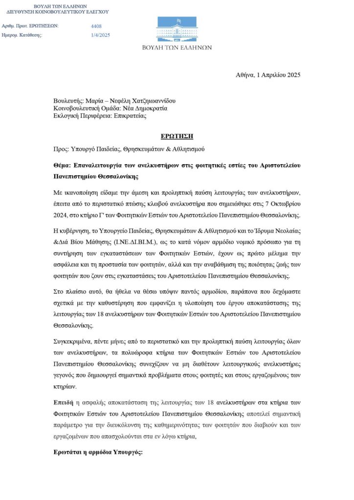 Επαναλειτουργία των ανελκυστήρων στις φοιτητικές εστίες του Αριστοτελείου Πανεπιστημίου Θεσσαλονίκης