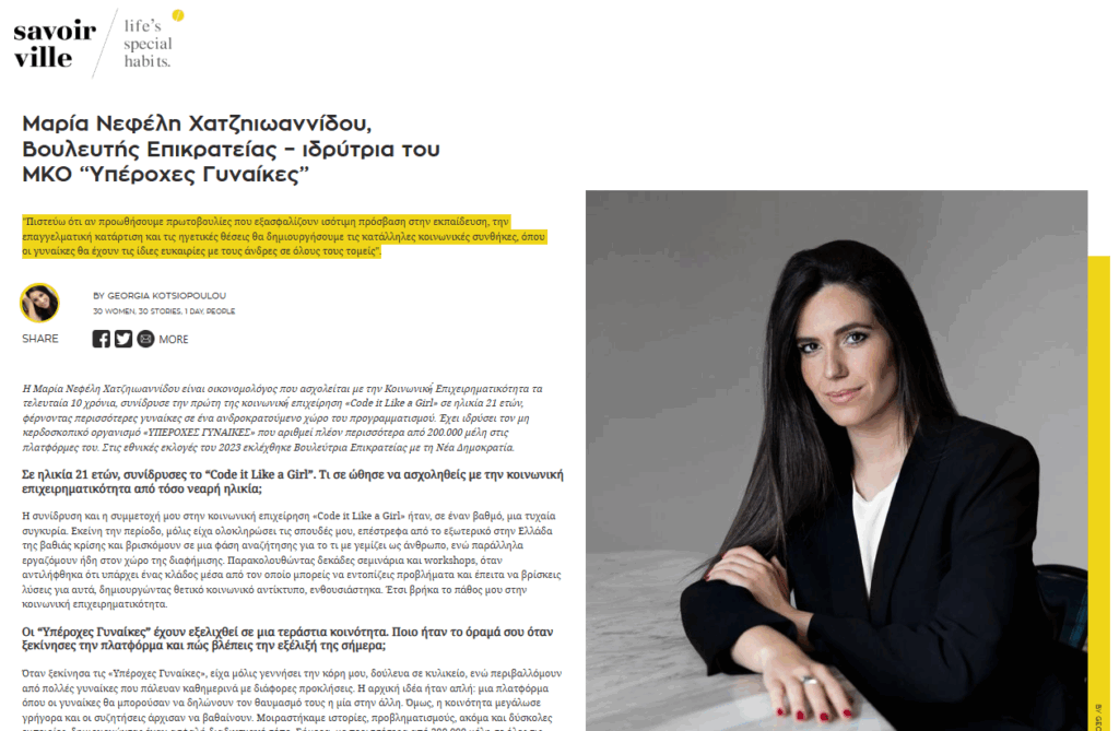 “Πιστεύω ότι αν προωθήσουμε πρωτοβουλίες που εξασφαλίζουν ισότιμη πρόσβαση στην εκπαίδευση, την επαγγελματική κατάρτιση και τις ηγετικές θέσεις θα δημιουργήσουμε τις κατάλληλες κοινωνικές συνθήκες, όπου οι γυναίκες θα έχουν τις ίδιες ευκαιρίες με τους άνδρες σε όλους τους τομείς”.