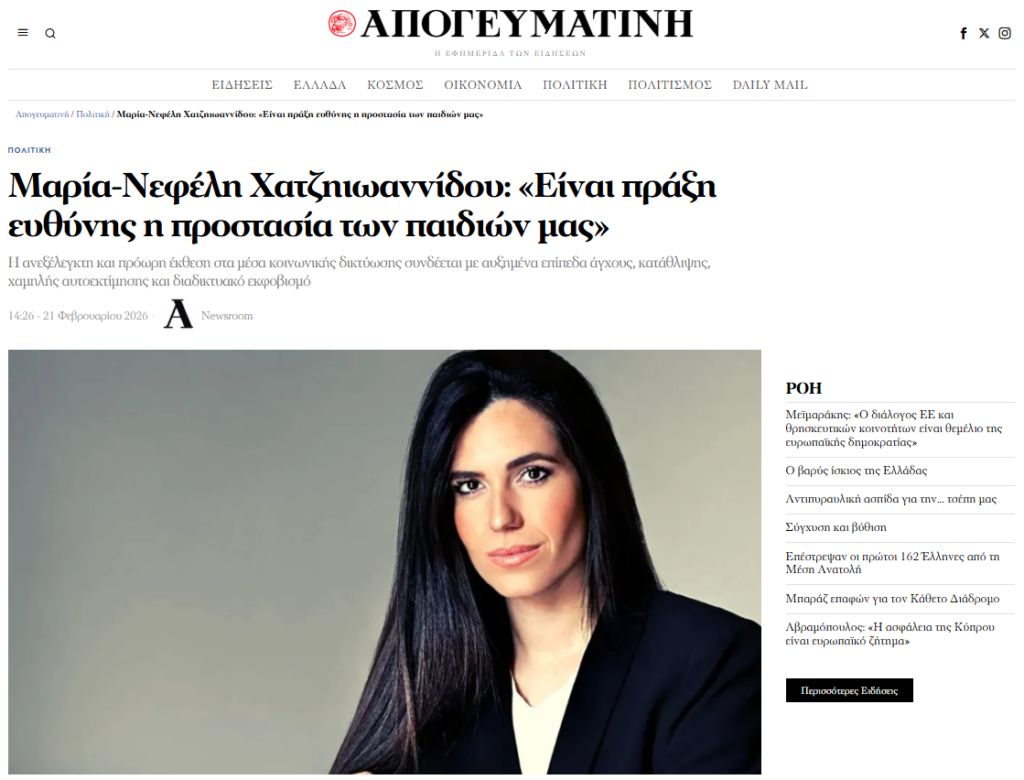 Ανήκω σε μια γενιά που δεν μεγάλωσε με smartphone ή tablet στο χέρι. Σήμερα, όμως, ως μητέρα δύο κοριτσιών, βλέπω καθημερινά πόσο εύκολα μια οθόνη ή τα social media μπορούν να γίνουν αντικείμενο έντασης ή διαμάχης. Πόση ώρα είναι «λογική»; Πότε η χρήση γίνεται ανάγκη; Πότε ξεπερνά το όριο; Αυτά τα ερωτήματα δεν απασχολούν μόνο τις οικογένειες. Οφείλουν να απασχολούν και την Πολιτεία. Σε αυτό το πλαίσιο, η συζήτηση για την απαγόρευση της χρήσης social media από ανηλίκους κάτω των 15 ετών δεν είναι ιδεολογική εμμονή ούτε αυταρχική παρέμβαση. Είναι συζήτηση ευθύνης. Όπως το κράτος θέτει ηλικιακά όρια για την κατανάλωση αλκοόλ ή την οδήγηση, έτσι οφείλει να θέτει όρια και στον ψηφιακό χώρο, όταν διακυβεύεται η ψυχική υγεία των παιδιών.